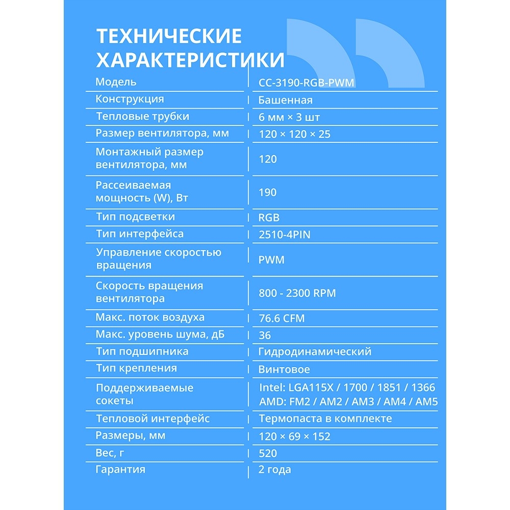 Охлаждающие системы CBR CBR-CC-3190-RGB-PWM Кулер для процессора, Al+Cu, 3 heat pipes, Socket 775/1366/1155/1156/1150/1151/1200/1700/AM2/АМ2+/АМ3/AM3+/FM1/FM2/AM4/AM5, TDP 190W, 120mm Fan, 2300RPM, HB, RGB, PWM, 36db