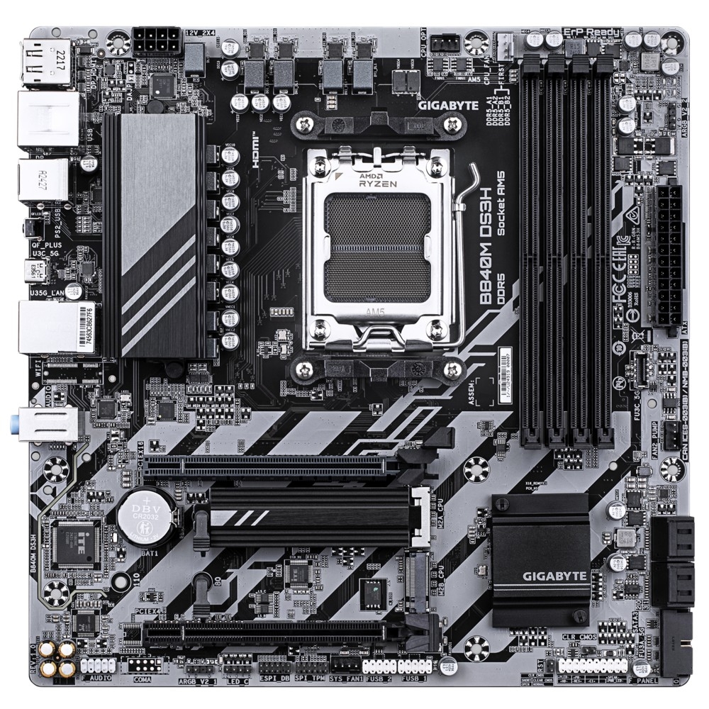Материнская плата Gigabyte B840M DS3H Socket AM5, AMD B840, 4xDDR5-5200, HDMI+DP+DP, 2xPCI-Ex16, 4xSATA3(RAID 0/1/10), 2xM.2, 8 Ch Audio, 1x2,5GLan, (4+4)xUSB2.0, (2+2)xUSB3.2, (1+1)xUSB Type-C™, 1xPS/2, mATX RTL